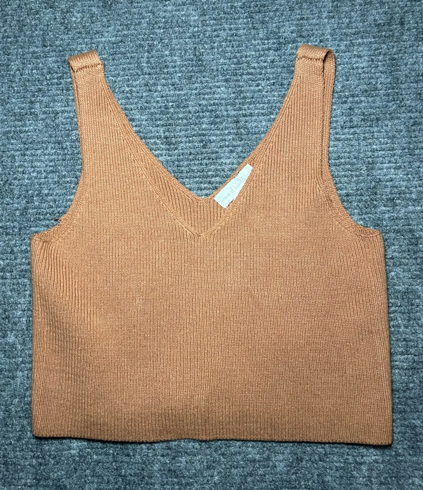 The House of Harlow 1960 Ribbed Brown V-Neck Tank Top in size Medium is a stylish and versatile addition to any woman's wardrobe. Made by Browns, this tank top features a flattering v-neckline and a comfortable regular fit. The brown color gives it a classic yet bohemian vibe, perfect for everyday wear or dressing up for a special occasion. Its medium size ensures a perfect fit for many women looking to add a trendy and chic piece to their clothing collection. Item is preowned and in good condition, please view all photos.