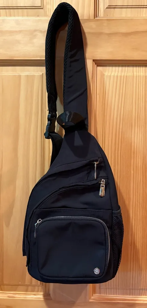 is a medium bag made of durable nylon, It has a distinctive triangle or oval shape. Known for its ample storage, it features multiple zippered compartments, including three front zip pockets, an interior zip pocket, and often four interior card slots. Designed for convenience, it includes a single adjustable strap that allows it to be a versatile black sling bag perfect for everyday use, casual wear, travel, and even workwear. Could be unisex. This bag is in EUC thanks for looking!