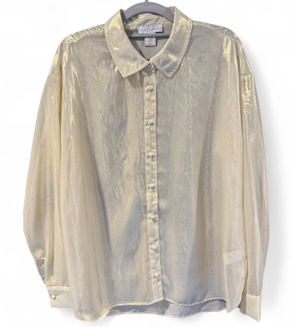 House of Harlow 1960 Sheer Shimmer Button Down Blouse Women’s M Gold Party Brand: House of Harlow 1960 Size: women's medium Material: 100% polyester Condition: pre loved in excellent condition, a few loose strings but not noticeable Ships quickly from a smoke free home Condition: pre loved in excellent condition, a few loose strings but not noticeable