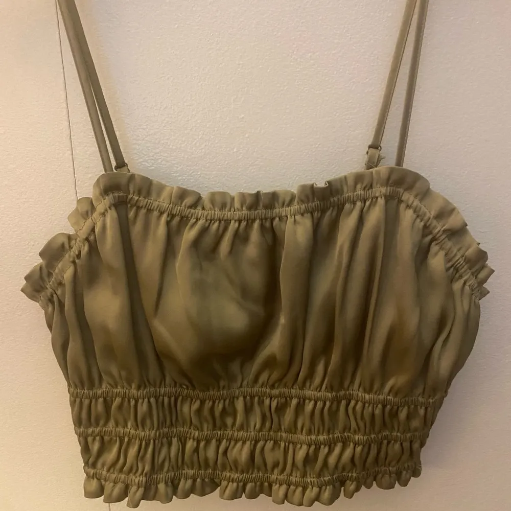 House of Harlow 1960 Two Piece Gorgeous Satin Effect Pants Set in Taupe featuring spaghetti strap, ruched, elasticized crop top with wide leg drawstring pants. Size small. NWT