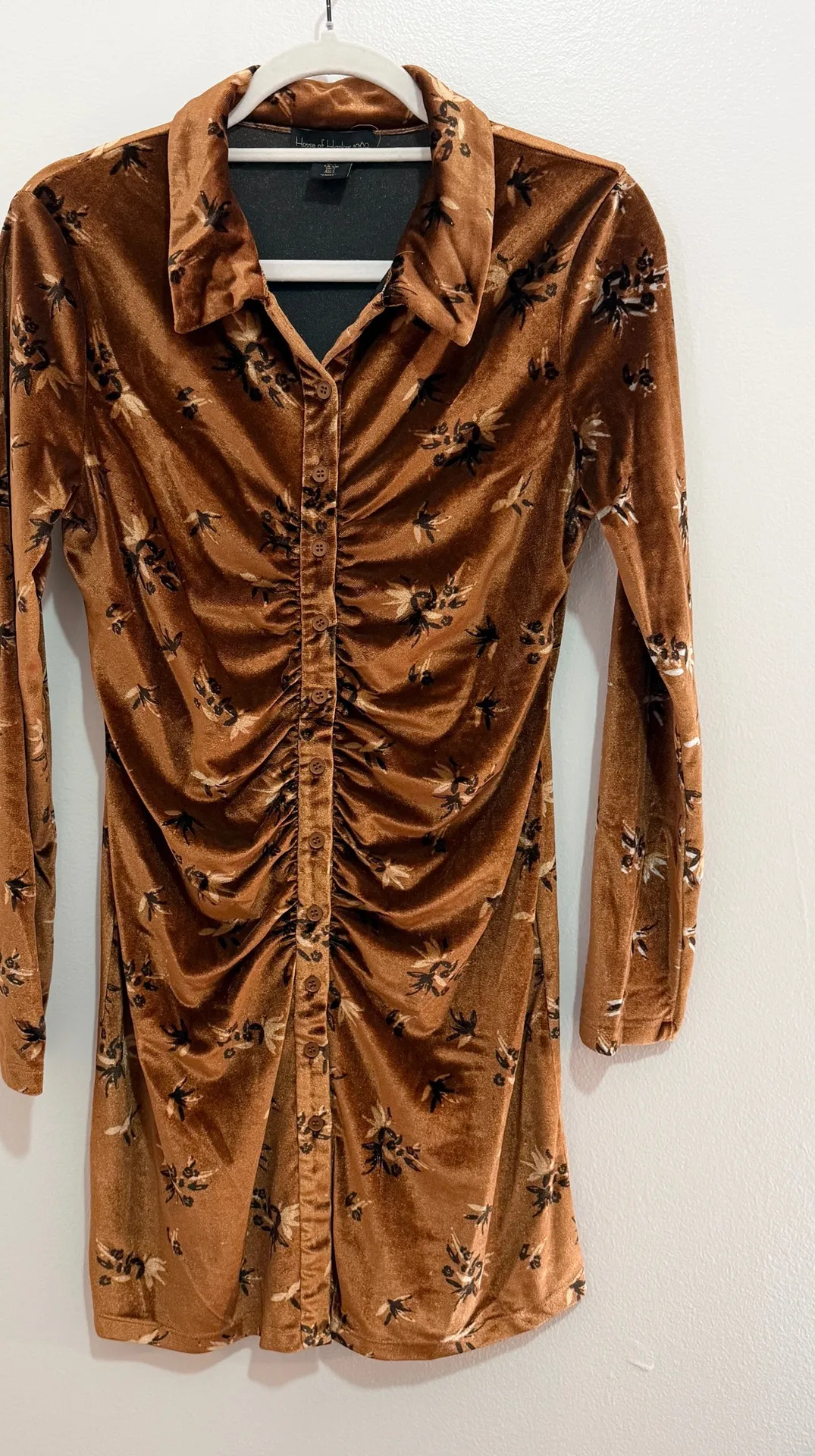 House of Harlow 1960 x Revolve velvet mini dress in size Small. Features a button front, ruched center detail, long sleeves, and collared neckline. Stretch velvet fabric with a flattering fit. Condition: Excellent used condition Measurements (flat): • 17” pit to pit • 14.5” waist • 33” length Perfect for fall events or date night. 907G