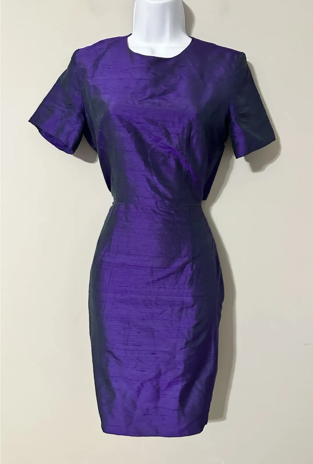 Designer: House of Holland (Henry Holland) An absolutely stunning and unique cocktail dress by the celebrated British designer, Henry Holland. Crafted from luxurious 100% pure silk with a vibrant, iridescent purple hue, this piece is a show-stopper for any special occasion. Style & Fabric Details: • Fabric: Features a beautiful, shimmery 100% Silk outer fabric (often referred to as Silk Dupioni or Shantung for its subtle, natural slub texture and iridescence). Fully lined in 100% Silk for a luxurious feel against the skin. • Color: Deep, vibrant, and iridescent purple/fuchsia. • Design: Flattering knee-length sheath silhouette with a chic round/crew neckline and short sleeves. • Key Feature: The standout detail is the stylish geometric cut-out at the lower back/waistline, adding a modern, edgy touch. • Closure: Side zip closure and a keyhole button/hook closure at the back neck. • Sizing: UK 8 / US 6 / EU 34. Made in Romania. Designer Cocktail Dress • Luxury Party Dress • Silk Dupioni Dress • Silk Shantung Dress • Iridescent Sheath Dress • Mod/Retro Party Dress • Knee-Length Sheath • Backless Detail Dress • Designer Evening Wear • Statement Dress House of Holland • Henry Holland • Purple Dress • Silk Dress • 100% Silk • Cutout Dress • Sheath Dress • Bodycon (or Fitted) • Short Sleeve • Knee Length • UK 8 • US 6 • Cocktail • Party • Special Occasion • Wedding Guest • Formal • Designer