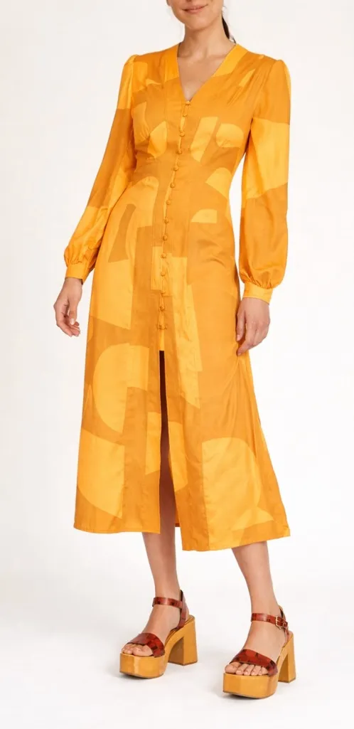 House of Sunny Cinema Dress in orange/yellow geometric print with button front, contoured panels, lo... Show more