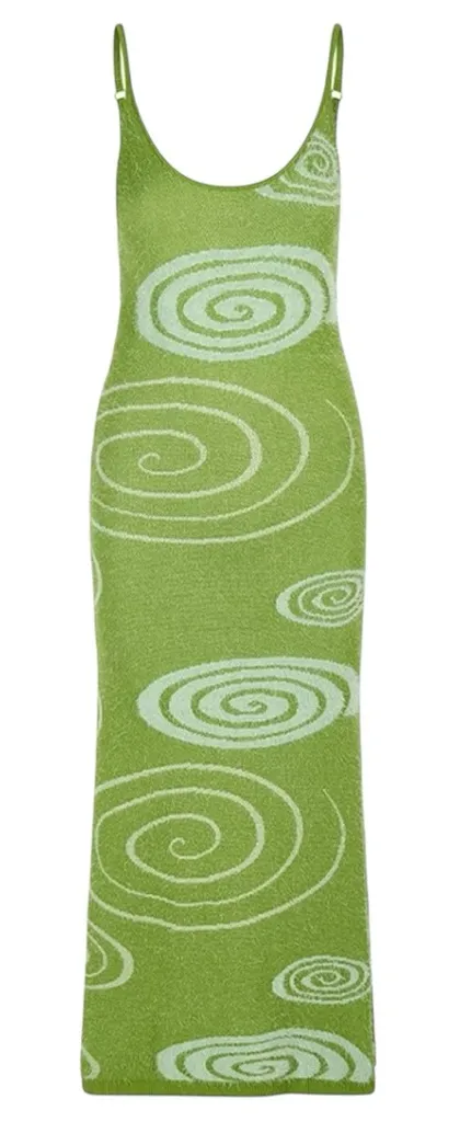 Classic House of Sunny knitted slip dress shape with back cut-out detail and swirl print inspired by outer space in green hues. By using the unique knit technique, this dress is a perfect trans-seasonal style and a great layering piece. Wear with a boot or a trainer to dress this style up or down. Adjustable straps Textured knit Super soft fluffy yarn 3/4 length Slim fit Developed yarn color. Color: Grass green Material: 60% Viscose, 40% Nylon. UK 6 (US 2) XS Length 38.5” (98 cm) Bust 27.5" (70 cm) Waist 27.5" (70 cm) Hip 27.5" (70 cm) Hem 46" (117 cm) Armhole diagonal 4.3" (11 cm) Neck drop at front- not including strap 2" (5.2 cm). This is a vegan knit product without the use of wool or fur. Made of Lenzing viscose (fibers made from natural wood) and dyed using methods supporting environmental protection regulations to remain as CO2-neutral as possible. NWT - New with tags, never worn
