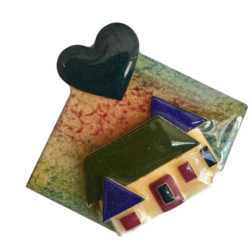 One-of-a-kind handmade brooch from the collectible House Pins® by Lucinda art series. Features a raised house design with a glossy deep-blue heart above it — a sweet “home is where the heart is” vibe. Mixed media collage encased in resin. Cute pop of color for jackets, bags, cardigans, or to display on a pin board. • Authentic House Pins® by Lucinda (labeled on back) • Dimensional raised elements (not flat!) • Multicolor design: deep blue, green, purple, warm cream tones 💡 Styling tip: Add it to a denim jacket, tote bag, or blazer lapel for an artsy, conversation-starting accessory. 📦 Same or next day shipping & packed with care. ✨ Condition: Very good pre-owned condition- wear on back ✨ Bundle to save! Free gift with a purchase of 3 or more items.