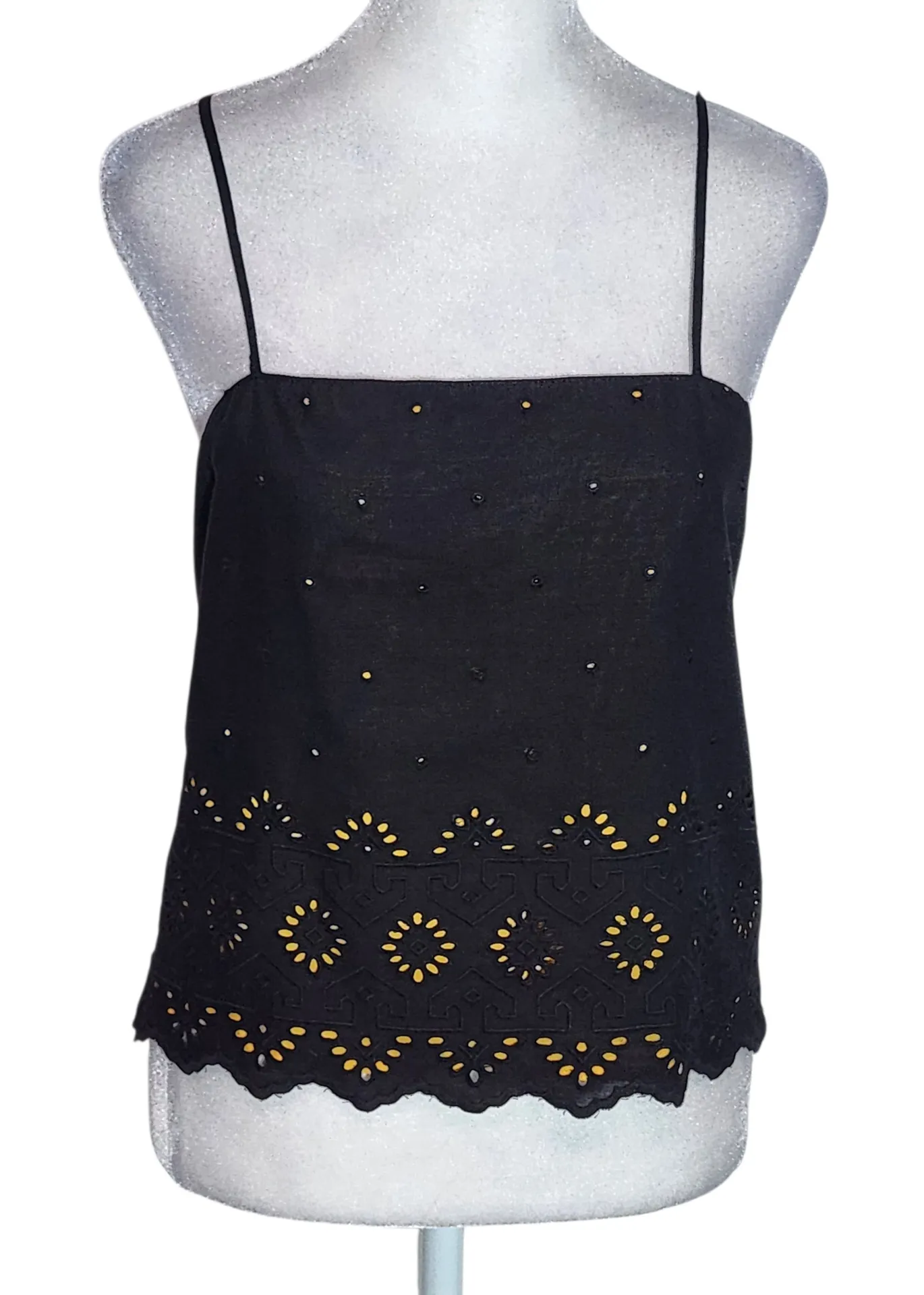 Howard Wolf black top with a gold lining and eyelet lace cutouts. The straps are tied in the back an... Show more