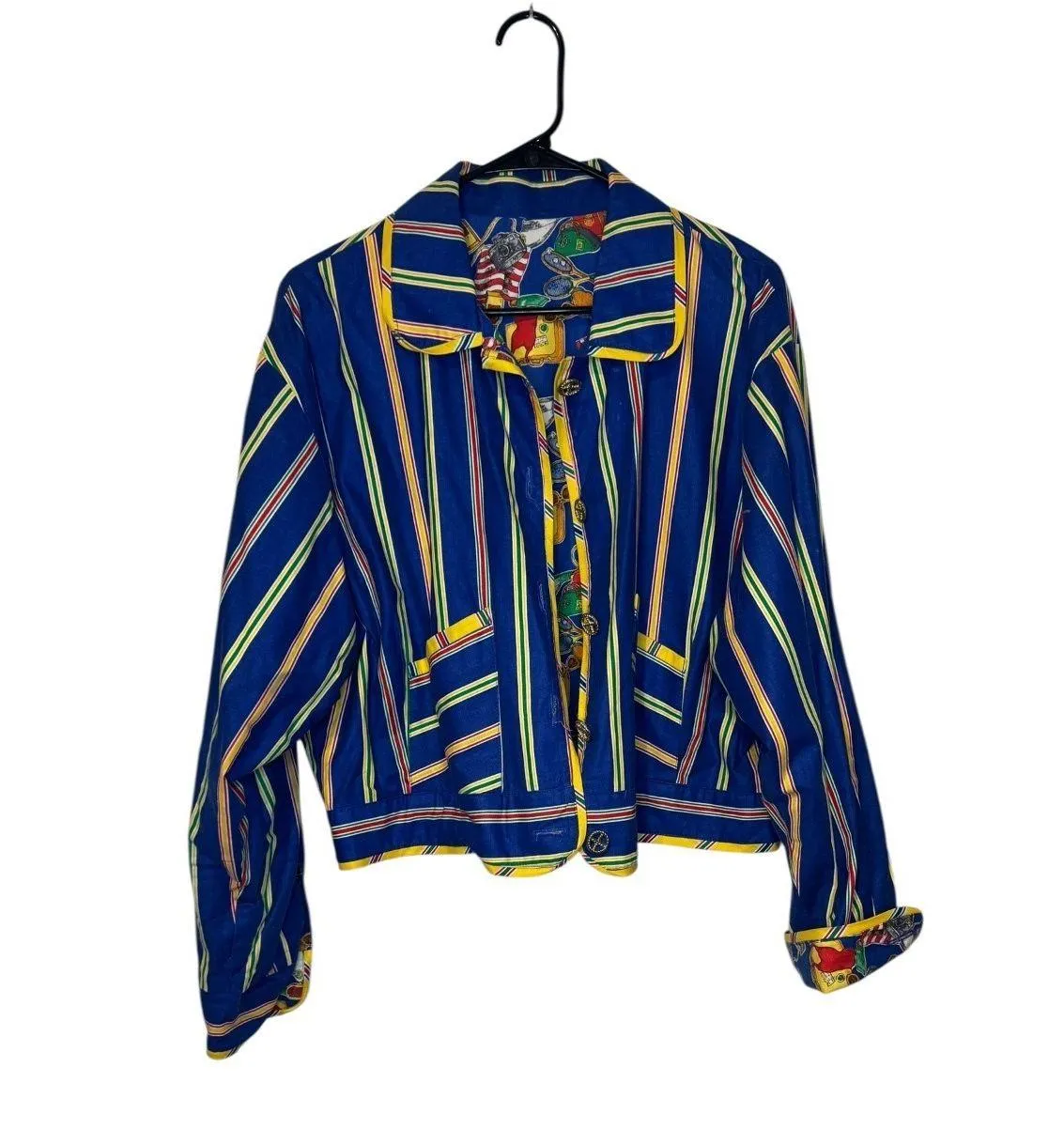 Brand- Howard Wolf Material- 100% Cotton Size- 12 Color- Blue Striped/Travel Items Reversible Measurements: Armpit to armpit- Under the arm measurement- 22.5" Shoulder to shoulder- Shoulder seam to shoulder seam- 19.5" Length- From bottom of collar to the end of the jacket- 22.5" Sleeves- From shoulder seam to end of cuff- 23.5" Condition: Pre-owned, very good used condition. See Photos. Thank you for Shopping. Feel free to check out my listings for various preloved items.