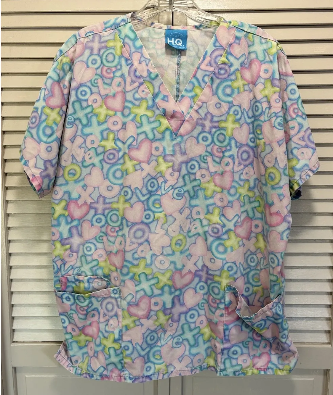 The HQ Scrub Love XOXO Print Size XL Scrub Top is a stylish and comfortable medical scrub top designed for women. Featuring a unique love and XOXO pattern in pastel colors like blue, pink, green, and purple, this V-neck top is made of soft cotton material for a comfortable fit. With convenient pockets and a personalized XL size measuring 24" pit to pit and 27" length, this scrub top from H.Q. Scrub is both practical and fashionable for medical professionals. (2832)