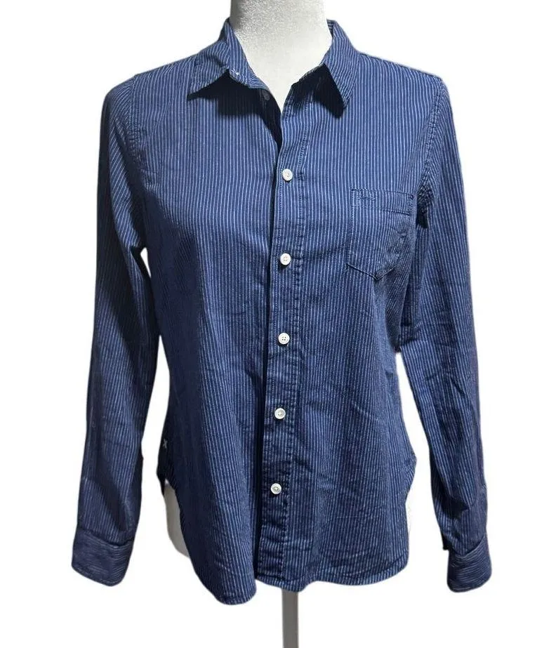 Alex Mill blue striped button down shirt in a breathable cotton-linen blend. Classic collared style with button front, chest pocket, long sleeves with button cuffs, and shirttail hem with signature stitched side detail. Lightweight and versatile “Wash & Go” fabric, perfect for casual wear, workwear, or layering. Excellent pre-owned condition, no flaws noted. Measurements (flat lay): pit to pit 19”, shoulder 13.5”, sleeve 24”, length 24”. minimalist, classic, timeless, prep, casual, workwear, quiet luxury, summer, spring. scandinavian style, preppy, lagom, coastal grandma, dark academia, light academia
