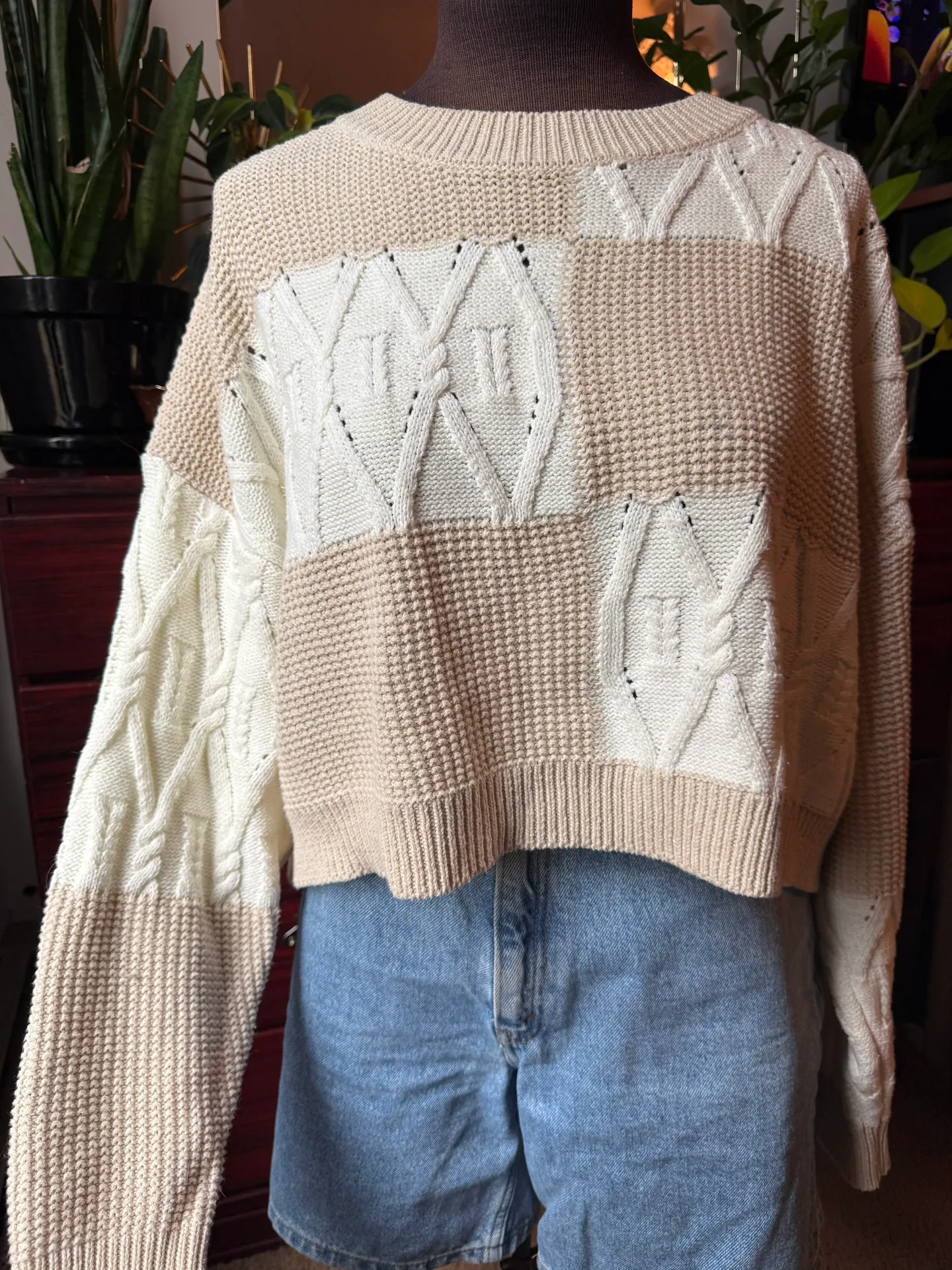 This cozy and chic sweater from Altar’d State features a unique two-tone cream and beige block desig... Show more