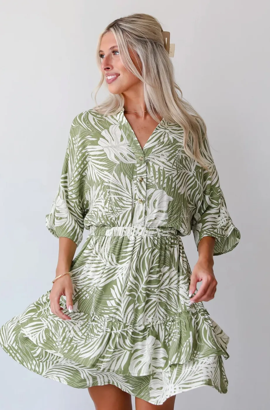 You'll be a hot "tropic" wherever you go this summer when you have a perfect beach accessory like the Destined For Sun Green Tropical Mini Dress! Crafted with meticulous attention to detail, this dress is designed to transport you to paradise with its lush tropical print and flattering silhouette, making it the perfect choice for sunny days and beach getaways alike. The rich green hue serves as the perfect backdrop for the vibrant tropical print, featuring lush palm leaves, colorful flowers, and exotic motifs that evoke images of sandy beaches and crystal-clear waters. Whether you're sipping cocktails by the pool or dancing the night away at a beachside party, this dress is sure to make a statement and turn heads wherever you go! Lightweight Woven Knit Fabrication Tropical Print Notched V-Neckline Functional Button Front Elastic Waistband Short Sleeves Flowy Fit Ruffle Hem Short/Mini Length Lined Skirt Self: 100% Rayon Lining: 100% Polyester Hand Wash Cold, Hang or Line Dry Model is 5'4" and wearing a Small. Garment Measurements in Inches: Medium | Bust 42” | Waist 30” (Stretches up to 36") | Hips 50” | Length 37.5”