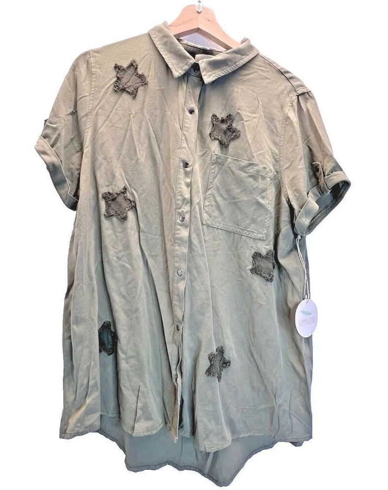 Hummingbird green olive blouse star Tencel woman short button sleeve size L Brand New!!! Brand Hum... Show more
