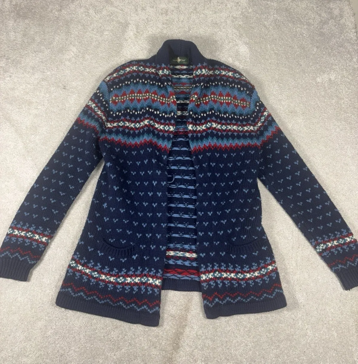 The Vintage JcP Hunt Club 100% Acrylic Cardigan Shawl Sweater in medium size is a stylish and cozy addition to any woman's wardrobe. This Fair Isle patterned sweater features a cardigan style with a multicolor design, perfect for adding a touch of retro charm to your outfit. Made from acrylic material, this sweater is both comfortable and easy to care for, making it a practical yet fashionable choice for the 90s-inspired fashionista.