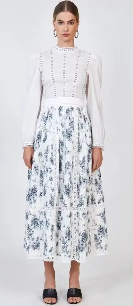 Hunter Bell Womens Toile Flamingo Wilson Maxi Skirt Size 8 Blue White NWT Features: Brand: Hunter Bell Type: Skirt Style: Maxi Size: 8 Color: Blue, White Material: 100% Cotton Condition: New With Tags - Back zipper closure - Allover toile pattern - Lace inset panels - Banded waistband - Pleated - Machine washable All measurements are done laying flat and are approximate. Waist: 14” Length: 34.5” Thank you for browsing my closet. If you have any questions feel free to message me. 5 star seller ⭐️ Bundle and Save 🛍️ Smoke free home 🏠 Next day ship📦