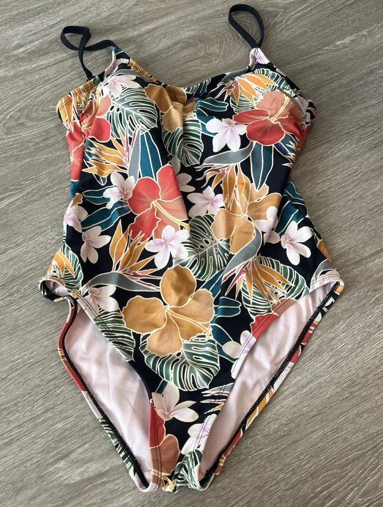 Hurley women’s size L black strappy back one piece Hawaiian floral hibiscus swimsuit