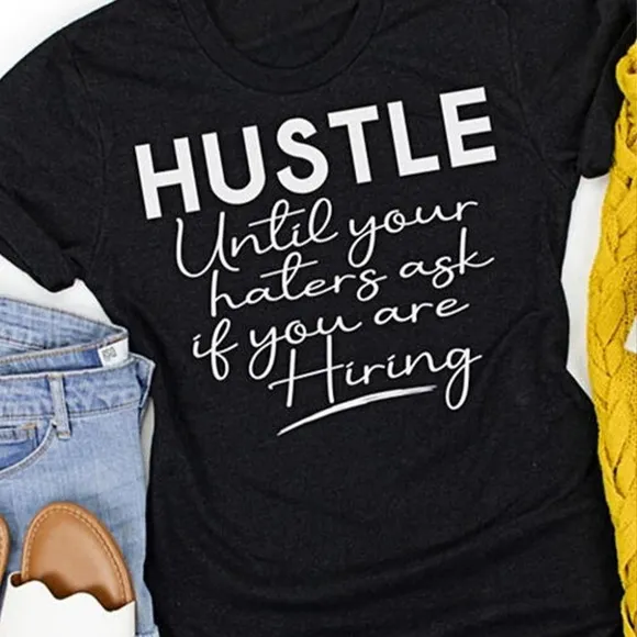 Introducing the “Hustle Until Your Haters Ask If You're Hiring” Black with White Lettering T-Shirt. This awesome graphic tee brings a statement style to your wardrobe. Its versatile design allows for knotting in the front or easy tucking, offering various styling options. Crafted from 95% polyester and 5% spandex, it’s not just a motivational piece but also soft, comfortable, and breathable, ensuring a light and cozy feel all day long. Always on trend - Priced to sell - All offers are accepted or countered Small (4-6) Medium (8-10) Large (12-14) XL (16-18) XXL (18-20)