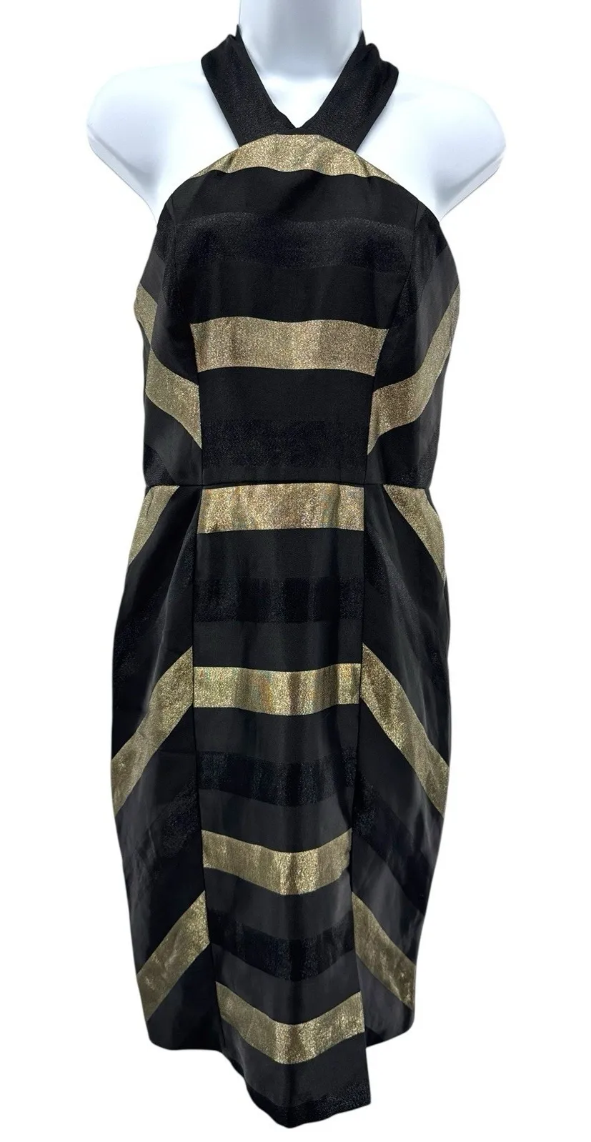 Make a statement in this stunning Hutch metallic striped halter mini dress. Featuring a bold black and gold chevron stripe pattern with a crisscross halter neckline and exposed back zipper, this cocktail dress is perfect for parties, weddings, or a night out. Fully lined with viscose rayon for comfort. Chic, sophisticated, and flattering. • Brand: Hutch • Size: 4 • Color: Black with gold metallic stripes • Style: Halter mini dress, cocktail party • Material: Shell 92% Polyester, 8% Metallic | Lining 100% Viscose Rayon • Closure: Back zip • Measurements: Length 41" | Pit to pit 16" • Condition: Excellent pre-owned Hutch dress, black gold cocktail dress, halter mini dress, party dress, holiday dress, wedding guest dress, metallic stripe dress, New Year's Eve dress