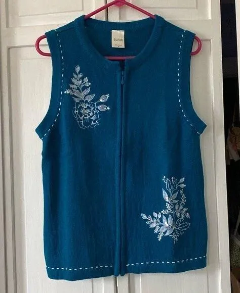 Zip up blue nature themed embroidered sweater vest. Leaves are embellished with sequins. Great laye... Show more
