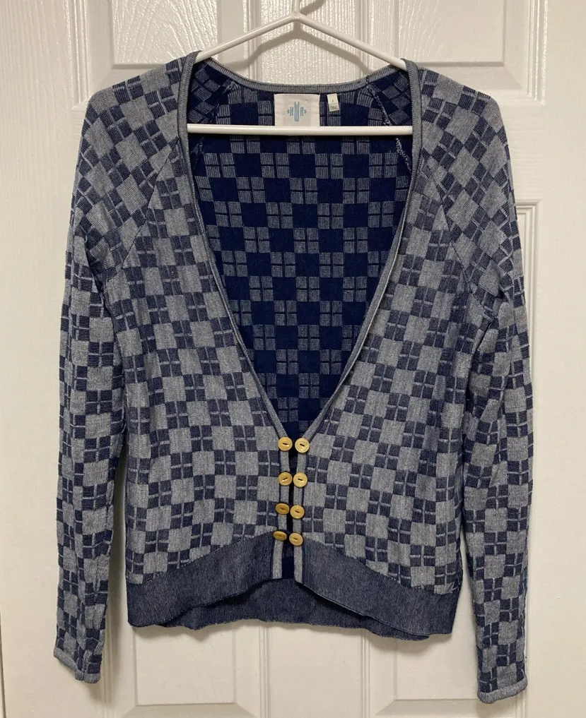 Good Condition Deep V Neck Heather Blue & Navy Blue Checkered Pattern 8 Button Loop Closure 69% Cott... Show more
