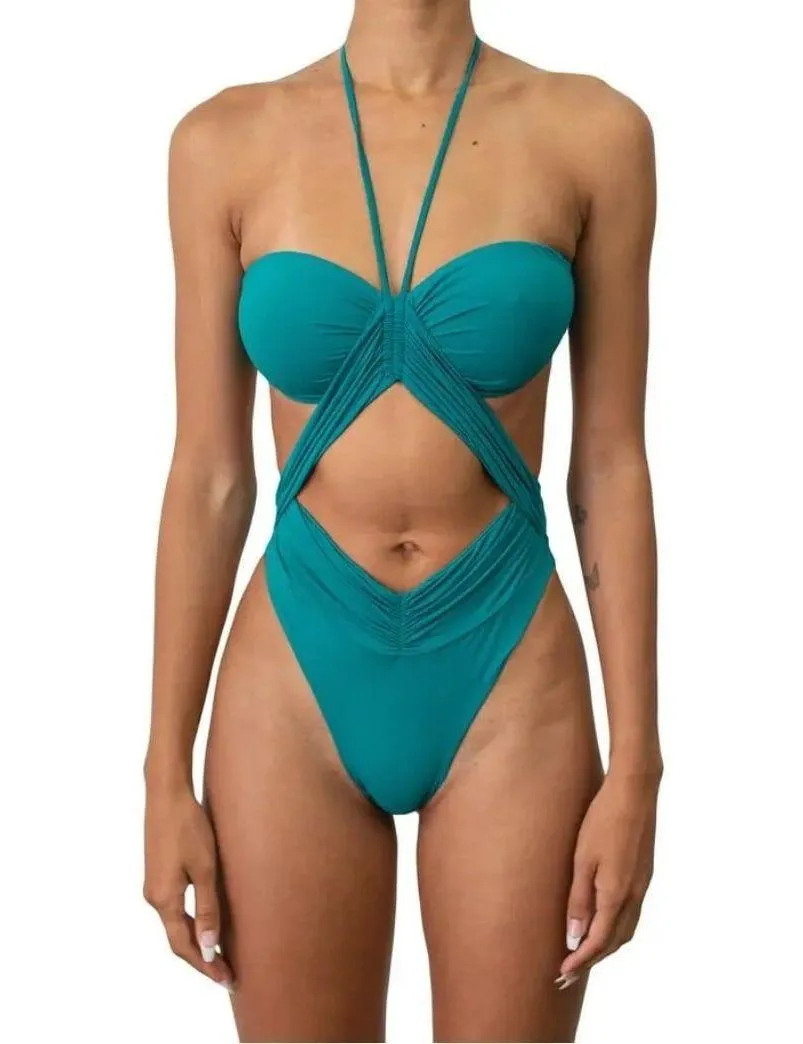 Turn heads at the beach or pool in this stunning teal one-piece swimsuit by Riot Swim. Features a flattering ruched front and back, unique cut-out design, and gold accent hardware at the back. Halter-neck tie ensures a secure fit. Made from a comfortable stretch blend of 87% nylon and 13% spandex. Measurements (laid flat): • Bust (across): 12.5” • Length (top to bottom): 18” Care: Hand rinse & dry in shade. Hygienic liner still attached. Size: XS (Extra Small) Perfect for pool parties, beach days, or tropical vacations! Original Retail $120 Hashtags: #RiotSwim #OnePieceSwimsuit #TealSwimwear #XSStyle #BeachBabe