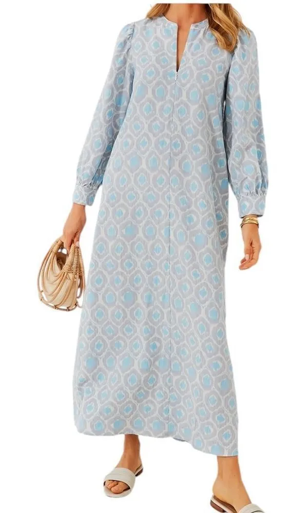 Hyacinth House represents classic femininity while edging on the side of flirty, bohemian, and playful. Through vibrant florals, textured ruffles, and bold patterns, the collection inspires women to embrace their romantic and whimsical side, seeking adventure, excitement, and celebration. The Zadie Dress has a whole lot of personality! The blue and lilac ikat print packs a subtle punch while the quarter zip allows for versatile styling options, leave it open for a flirty finish or zip it up for additional coverage. In a relaxed maxi length that'll keep you feeling like your best breezy self, we are wearing this with sandals and your go-to bag for park picnics and margarita happy hours. Round neckline Slightly puffed long sleeves Button cuffs Quarter front zip Side pockets Relaxed fit Material: 55% Linen, 45% Rayon Care: Hand wash cold, do not bleach, do not tumble dry, iron low Size XS Excellent preowned condition Pit to pit 17.75” Length 52.5” 2300-4