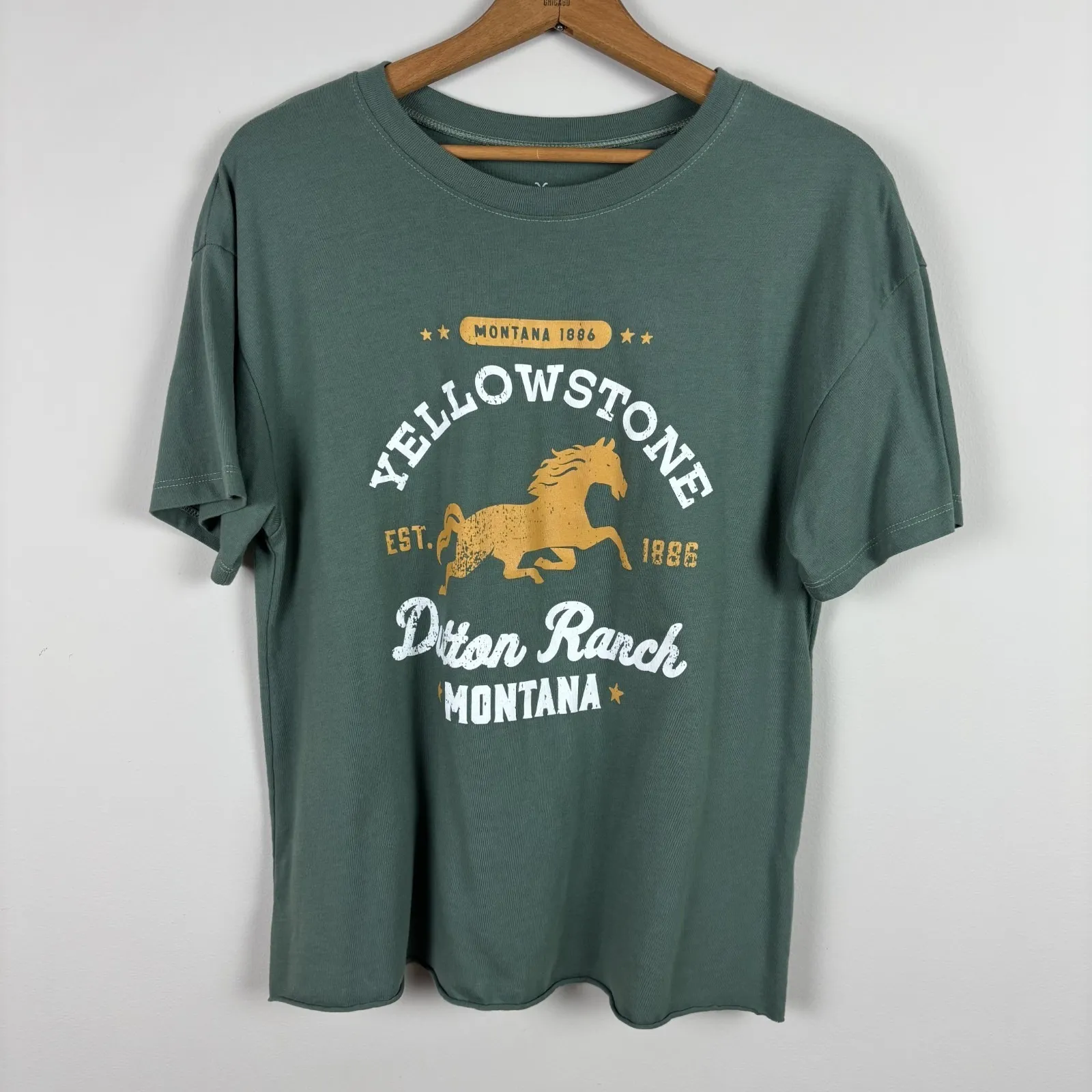 Very good condition! Measurements are in the photos. Fabric content and washing / care information in photos - see tag photos. Pullover Short sleeve Crewneck Lightweight, breathable Horse graphic Unfinished hem All preowned items have been cleaned. Stored in a smoke and pet free home. Thanks for looking!