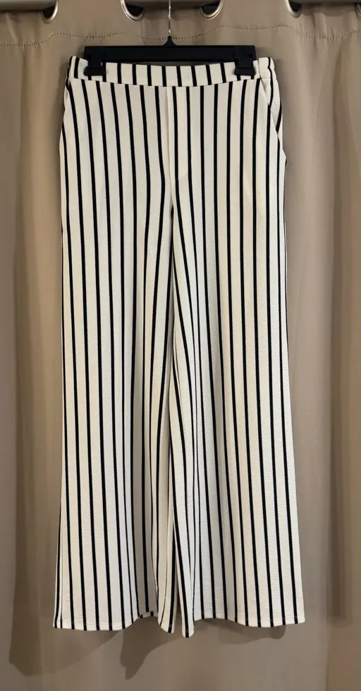 Elevate your style with these chic black and white striped pants. Perfect for any occasion, these pa... Show more