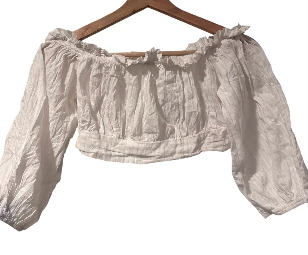 off-shoulder blouse with ruffle details. Hyfve White Off-Shoulder Women's Top Size Small measurem... Show more