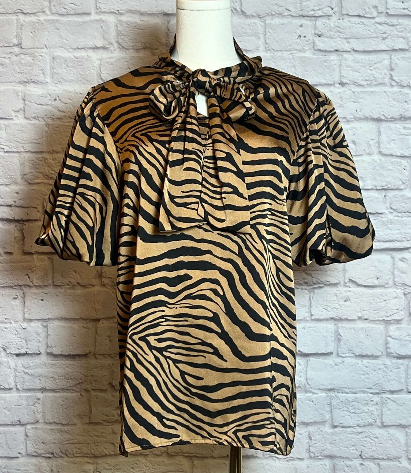 This Entro blouse features a bold mocha and black zebra print with a tie-neck detail. The short puff... Show more