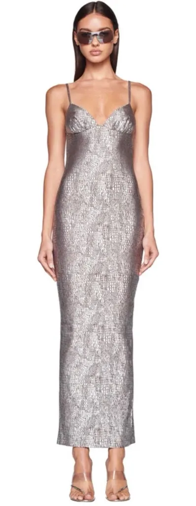 NEW NWT Metallic silver and brown croc printed maxi dress Skims the body and finishes in a straight hem Skinny shoulder straps in self printed fabric Adjusters on straps to tighten or loosen as needed V-neckline with triangle bust cups Gathered detail along the bottom of the bust cups Exposed open back Pull on construction Unlined - This fabric is not sheer We recommend wearing no bra or pasties with this garment Exclusive I.AM.GIA All over print - Designed in house by our design and graphics team (please note that not all styles will appear the same due to the nature of the print) Y2K, sundress, Summer, spring, striped,,, 70s, 80s, 90s, boho, bohemian, lightweight, airy, breezy, date, brunch, hollywood, celebrity, melrose, sustainable, eco-conscious, eco-friendly, fitted, a-line, fit & flare spring, retro, midi, thigh split, velvet, stretch, flattering, feminine, flirty, fitted, curvy, dual chromatic, forest, Lace, Sparkle, Neck, Frill, Romantic, Bardot, Travel, Blogger, Party, airy, bow, highwater, crop, high end, silk, runway, New Years, holidays party dress, night out, date night, ladies night, hippie, concert, hipster, music festival, fringes, embroidery, stripes, plunging neckline ,Doen, Coachella, tomatoe girl, pinup, ROMANTICISM REDEFINED. Bloggers favorite Leather, suede, free people, urban outfitters, cowboy, western, tassles, Anthropologie, deep V neck, ulla Johnson, Anine bing, free people, western, cowboy, vintage, rocker, studded, Valentine's Day,