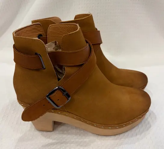 Gorgeous Free People Bungalow clog boots in a rich tan suede with wooden platform heel and wrap-arou... Show more