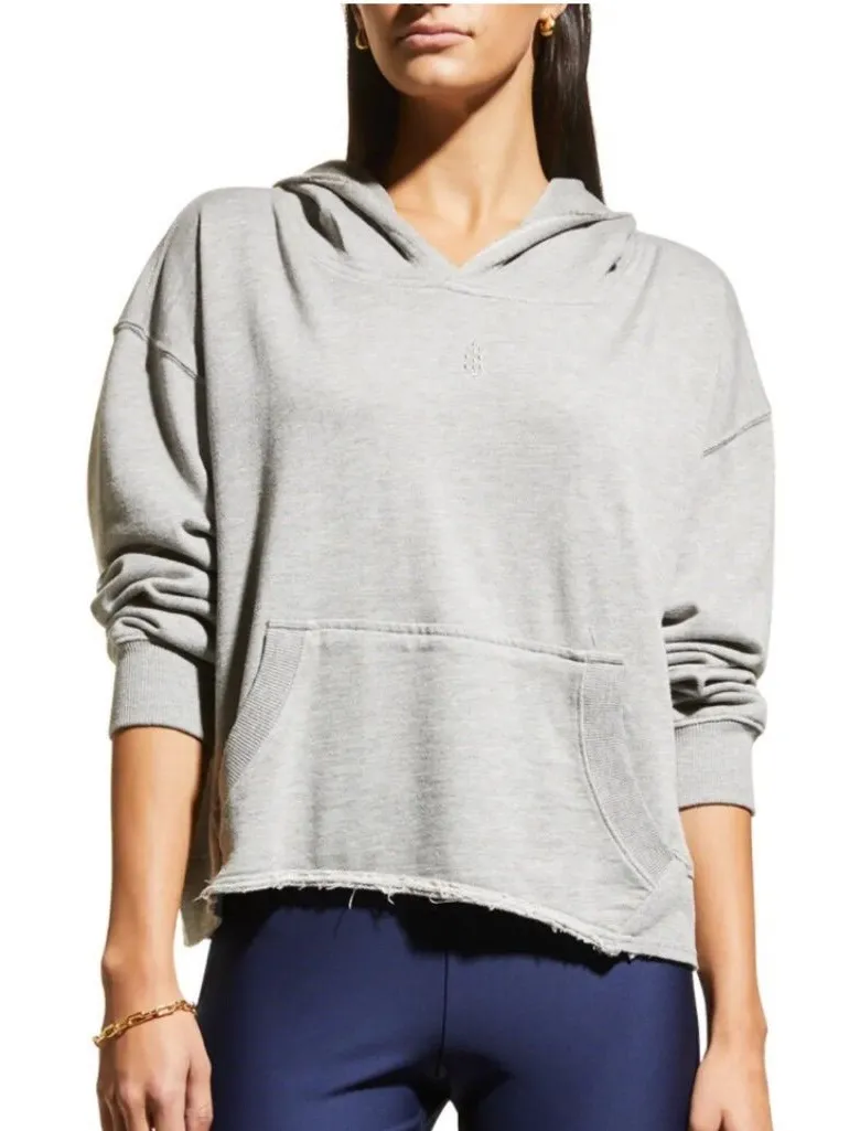 This is a Free People Movement All Sport Hoodie Sweatshirt in size XS. It is a pullover style hoodie with long sleeves, made of 100% cotton material in a relaxed fit. The color is gray, and it features an oversized design with pockets, and a small logo embroidered on the chest. It also features a lined hood with raw hems, suitable for activewear, loungewear, and sports-themed occasions. No noted flaws. Tags: workout, athletic, athliesure, casual, training, cozy, loungewear, warm, sporty, sports, crop, cropped, raw hem, kangaroo pocket, gym, minimalist