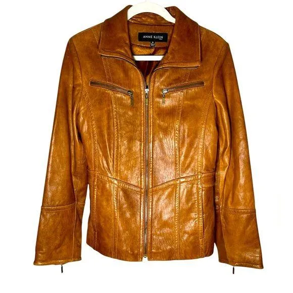 Beautiful camel colored longer line vintage leather coat by Anne Klein. A 90s classic the jacket is... Show more