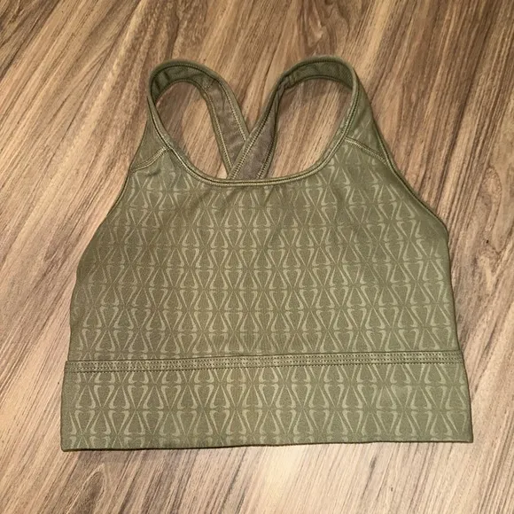 Elevate your workout wardrobe with this stylish and functional Nike sports bra. A subtle, repeating pattern adds a touch of visual interest to the olive green fabric. The cross-back design not only looks chic but also provides excellent support and freedom of movement. The Dri-FIT technology ensures you stay cool and dry, wicking away moisture during even the most intense workouts. Perfect for yoga, running, or any medium-impact activity, this sports bra combines performance and style seamlessly. Wear it to the gym, a fitness class, or even as a comfortable everyday top.