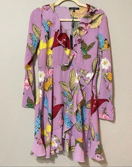 Romeo & Juliet Couture Purple Floral & Bird Print Ruffle Mini Dress M New with tags III30