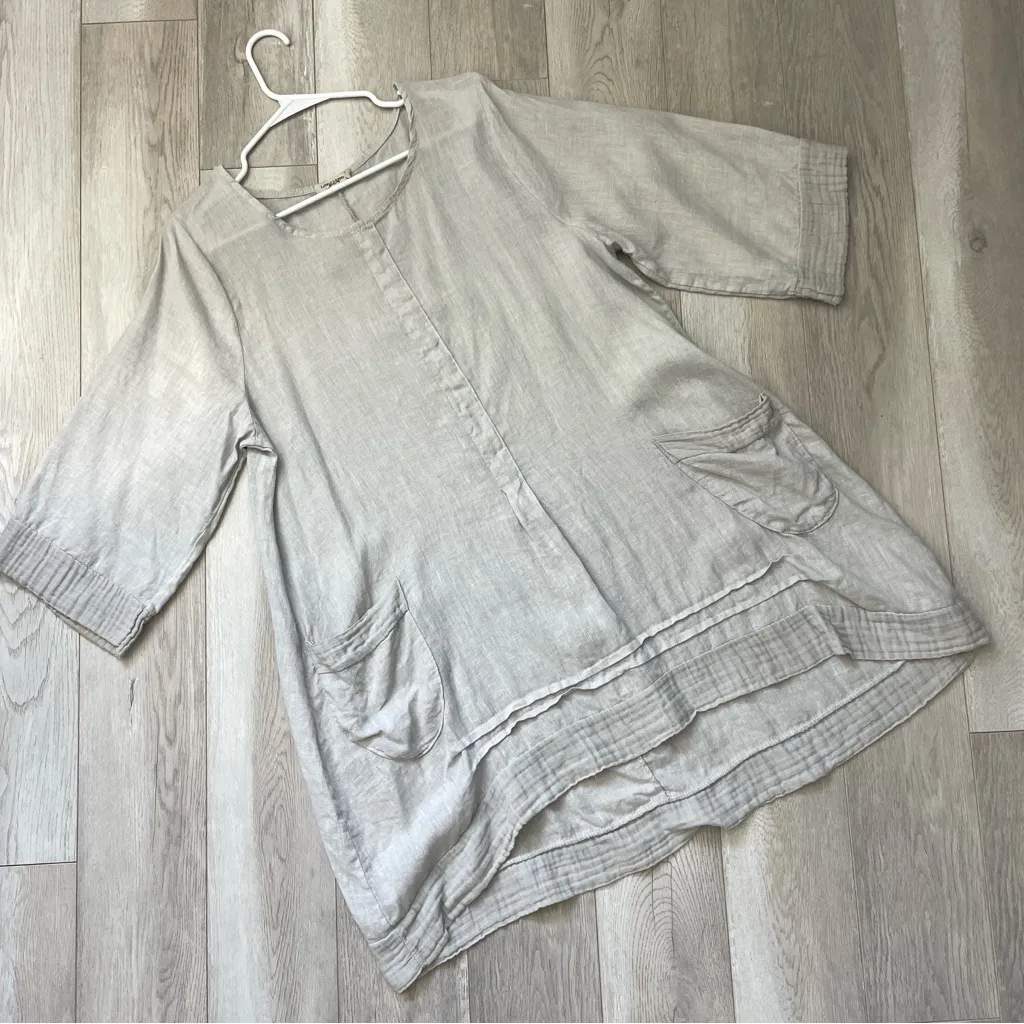 Lungo L'Arno Linen Lagenlook Tunic in the color light gray. Scoop neckline, 3/4 sleeve. Lightweight, breathable, semi-sheer woven fabric with gauze trim. Oversized, relaxed fit. Longer length tunic. Size 1x, womens. In great pre-worn condition, there is just a little bit of staining on the sleeve (primarily on the interior, not super visible on the exterior part of it!). 100% linen. Made in Italy. Super cute lagenlook, art to wear, natural fibers, coastal, minimalist, casual, spring summer style. //C209, 9.7