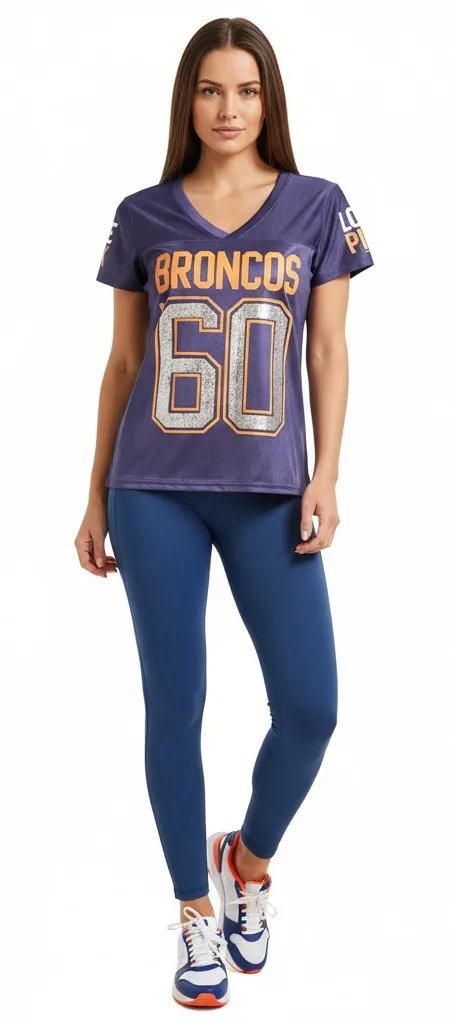 Show your team spirit in style with this limited edition Victoria's Secret PINK NFL Denver Broncos jersey. This blue V-neck top features dazzling sequins and glitter details on the "60" and "BRONCOS" lettering, making it a standout piece of fanwear. Perfect for game days or casual outings, this piece combines sporty appeal with a touch of glamour.