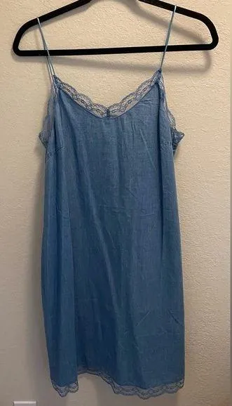 Has lace detailing at the hem and top of the dress. Spaghetti straps. 65% Lyocell 35% Cotton In gr... Show more