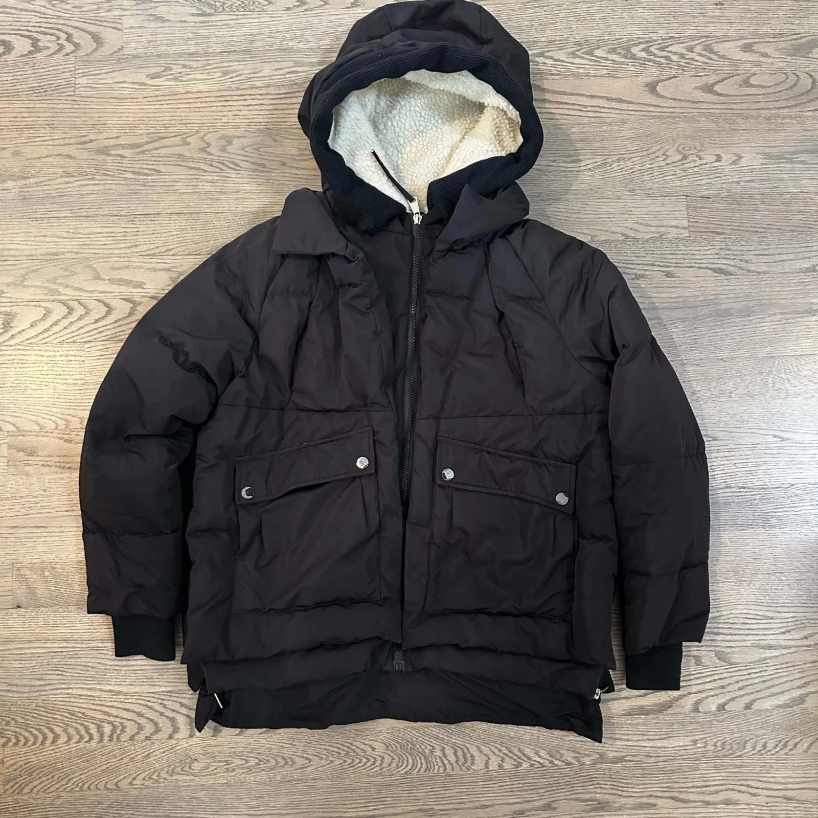 Embrace the chill with this supremely cozy down puffer coat, a sanctuary of warmth against winter's harshest bite. Plush sherpa lining cocoons the hood, offering a gentle caress against your skin while providing superior insulation. The classic black exterior makes it effortlessly chic. Roomy front pockets with stylish snap closures provide secure storage for your essentials, while ribbed wrist cuffs trap warmth and enhance comfort. Designed with a slightly longer length and subtle shaping, this coat adds an element of practicality and sophistication to your look. Throw it on for a walk in the snow, a stylish errands run, or a cozy coffee date. Type: Coat Outer Shell Material: Nylon Style: Puffer Jacket Department: Women Color: Black Lining Material: Nylon Fabric Type: Taffeta Features: Insulated, Pockets, Water Resistant, Wind-Resistant, Thermal, Hooded, Sherpa Lined Accents: Button, Zipper Pattern: Solid Jacket/Coat Length: Mid-Length Keywords: down coat, puffer jacket, black coat, winter coat, womens jacket, sherpa lined, hooded coat, padded jacket, quilted coat, small coat, warm coat, casual coat, outerwear, snow coat