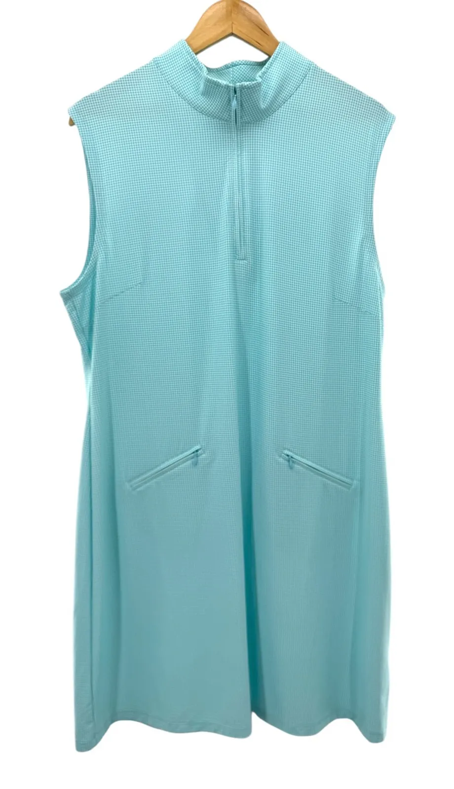 A sleeveless mock neck golf dress in a refreshing aqua gingham pattern. This dress features a convenient quarter-zip neckline and two zippered pockets for practicality. Designed with 'Cool Feel' technology for comfort, it offers UPF 50+ sun protection and quick-drying properties. Perfect for a day on the golf course, a leisurely brunch, or running errands on a warm day. Measurements: • Pit to Pit: 24 in • Waist: 23 in • Hips: 24 in • Length: 39 in Department: Women Style: Shift Fabric Type: Gingham Closure: Zip Sleeve Length: Sleeveless Season: Summer, Spring Material: 92% Nylon, 8% Polyurethane Pattern: Gingham Neckline: Mock Neck Occasion: Activewear, Casual Sleeve Type: Cap Sleeve Keywords: IBKUL, Women's Golf Dress, Sleeveless Dress, Mock Neck Dress, Aqua Gingham, UPF 50+, Cool Feel Technology, Quick Dry, Zipper Pockets, Athletic Dress, Activewear, Golf Attire, Summer Dress, Sporty Dress, XL Dress