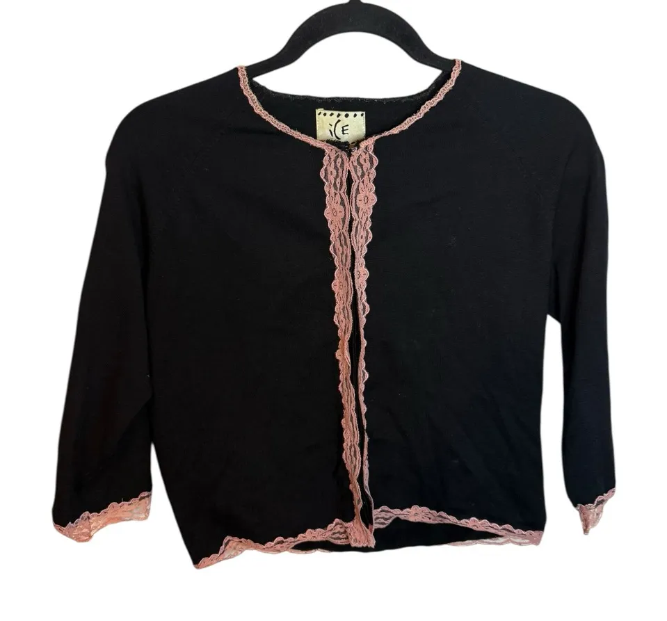 Pre owned excellent condition worn a handful of times. Gorgeous black silk blend cardigan with baby pink lace trim. This is a style from the 90s/early 2000s and is so Y2K. A must have! WOMENS size 4. Length 20” Armpit to armpit 19”