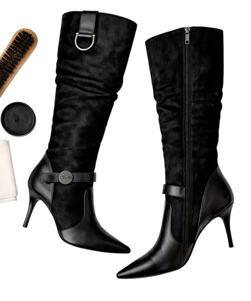 Icone Italy Black Pony Hair Leather Knee High Boots Pointed Toe Stiletto 36 Icone Italy knee-high boots crafted in Italy from black pony hair and smooth leather, featuring a pointed toe and sleek stiletto heel. A fashion-forward statement boot that elevates dresses, skirts, or tailored denim. The textured pony hair shaft contrasts with the smooth leather foot and heel for a refined, high-impact silhouette. Side zip closure provides a secure, streamlined fit while elongating the leg. Very good pre-owned condition with light wear. Pony hair remains intact with no bald spots noted. Leather is smooth, heels show minimal wear, and interiors are clean. Italian size 36. Made in Italy. #iconeitaly #kneehighboots #ponyhairroots #designerfootwear #italianmade