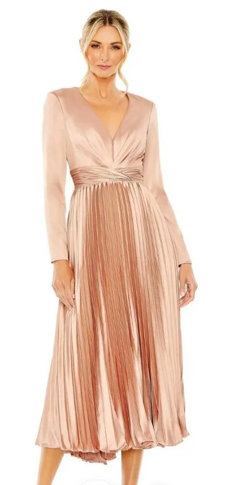 Brand new with tags, never worn! Please note: there are two tiny thread imperfections shown in the video. The dress is new — these small flaws occurred only from display and storage and are barely noticeable. The visible stitching along the pleats is part of the dress's original design detail. Size: 10 Color: Rose / Light Pink Style: 27148 This elegant tea-length dress boasts a classic deep V-neckline and long sleeves. Delicate pleats enhance the sophisticated silhouette, while the high-quality fabric ensures lasting style. Ideal for any formal affair, this versatile dress is a timeless wardrobe essential. Satin charmeuse fabric (100% polyester) Fully lined V-neck Long sleeve Pleated skirt Concealed back zipper Approx. 48" from top of shoulder to bottom hem Pit to pit: 19" Waist: 15.5" elegant, formal, wedding guest, bridesmaid, cocktail, party, evening, special occasion, romantic, feminine, classic, chic, timeless, spring, summer, event, formalwear, tea-length, pleated, polished, dressy, refined, luxe, flattering, soft, pastel, rose, sophisticated, graceful, charm, polished look, wardrobe essential