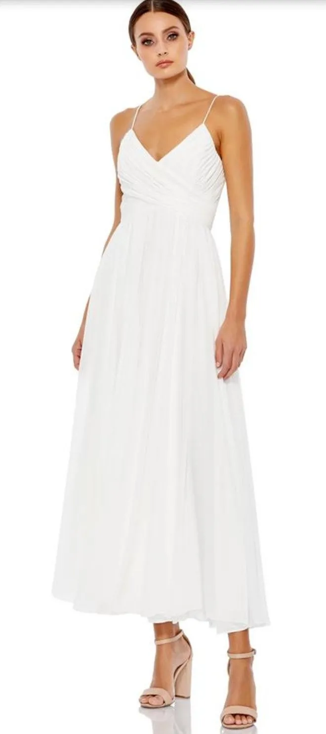 This spaghetti strap chiffon dress features a crossover v-neckline, ruched bodice, and a midi-length A-line skirt. Size: Small Color: White Ieena for Mac Duggal Fully lined Concealed back zipper Chiffon fabric (100% polyester) Spaghetti Straps Tea length V-neckline Approx. length from shoulder to hem: 50" Style #2650 This item is in excellent pre-owned condition. Please see all photos for signs of wear. Always happy to answer any further questions.✨ A timeless choice for any special occasion. This piece makes the perfect wedding guest dress, cocktail party outfit, or polished evening look. Designed with classic elegance, it’s ideal for receptions, anniversaries, or formal dinners. Pair with heels and jewelry for a sophisticated statement that’s both chic and unforgettable.