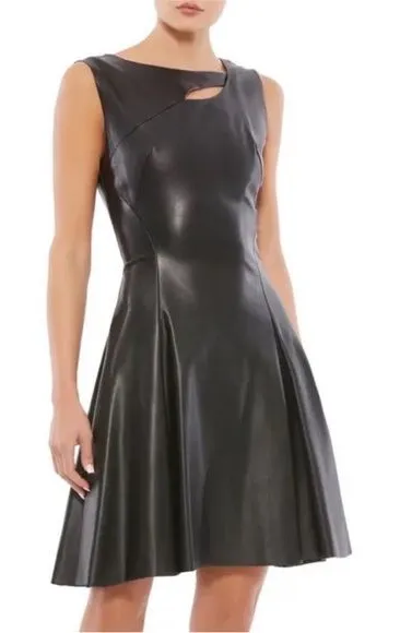 Black faux leather cocktail dress with sleek fit & flare silhouette Asymmetric neckline with mini cutout detail Sleeveless, structured bodice with panel seaming Hidden back zip closure Knee/above-knee length Modern, edgy, evening/party style Fabric: 100% polyester (faux leather finish) Care: professional spot clean only New with tags Size: 2 Chest: 14" Waist: 13" Length: 35" ieena for mac duggal dress, mac duggal faux leather dress, black fit and flare dress, cutout cocktail dress, sleeveless party dress, edgy little black dress, modern cocktail dress, vegan leather dress, night out dress