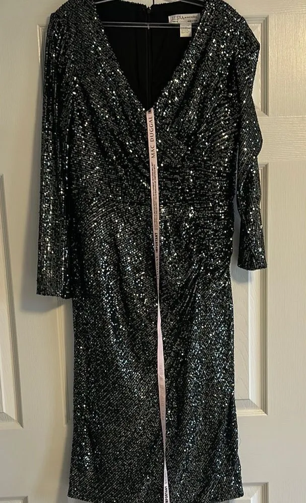 Ieena by Mac Duggal Black Sequined Faux Wrap V Neck Long Sleeve Midi Dress. Shine in this elegant black sequin dress, perfect for any special occasion. The shimmering sequins add a touch of glamour to your wardrobe. Size 12. Brand new never worn. Security ribbon tag still on. 44” shoulder to front hem. 17.5” pit to pit. CJ