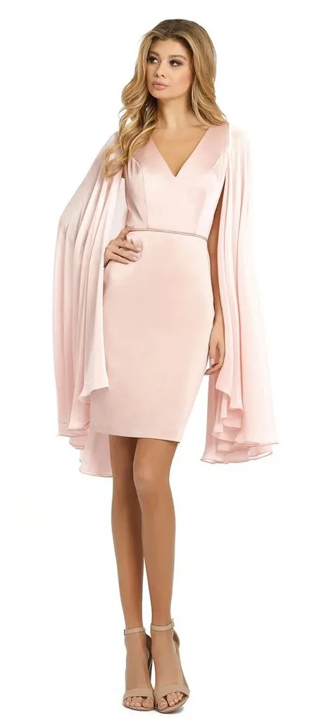 Ieena for Mac Duggal Crepe and chiffon fabric (100% polyester) Fully lined through body; sheer unlined cape sleeves V-neckline Cape sleeves Concealed back zipper Approx. 33" from top of shoulder to bottom hem Style #55358