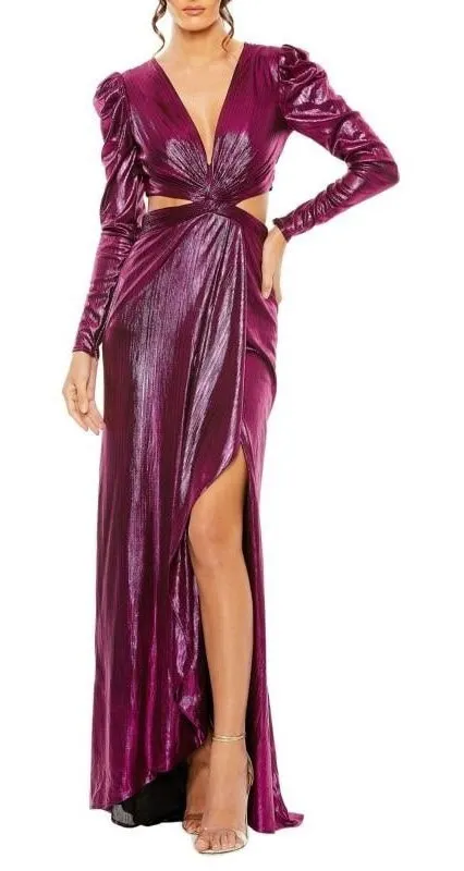 A metallic finish adds high-shine allure to this Mac Duggal gown, featuring sleek cutouts and a daring front slit. Plungeneck Long ruched sleeves Cutout bodice Front slit Back zipper Polyester Lining: Polyester Column silhouette Pit to pit ~14in Length ~64.5in Model measurements: 5'10" tall Model is wearing a US size 4 MSRP $498
