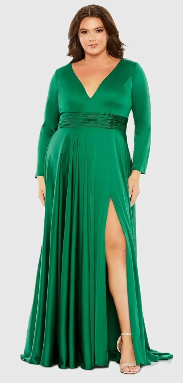 Command attention in this stunning IEENA for MAC DUGGAL emerald green gown. The flattering V-neckline and elegant long sleeves create a sophisticated silhouette, while the empire waist with intricate ruching cinches you in beautifully. A dramatic high slit adds a touch of allure and graceful movement with every step. Perfect for a formal gala, a sophisticated wedding guest ensemble, or an unforgettable evening event. Measurements: - pit to pit: 22 in - Waist: 21 in Style: Maxi, Ball Gown Dress Length: Long Department: Women Sleeve Length: Long Sleeve Pattern: Solid Occasion: Formal, Party/Cocktail Material: Polyester Fabric Type: Satin Neckline: V-Neck Season: Fall, Winter, Spring, Summer Sleeve Type: Long Sleeve Closure: Zip Accents: Pleated Features: Side Slit, Ruched Keywords: emerald gown, plus size formal, evening wear, prom dress, black tie, elegant, sophisticated, special occasion, designer dress, velvet trim