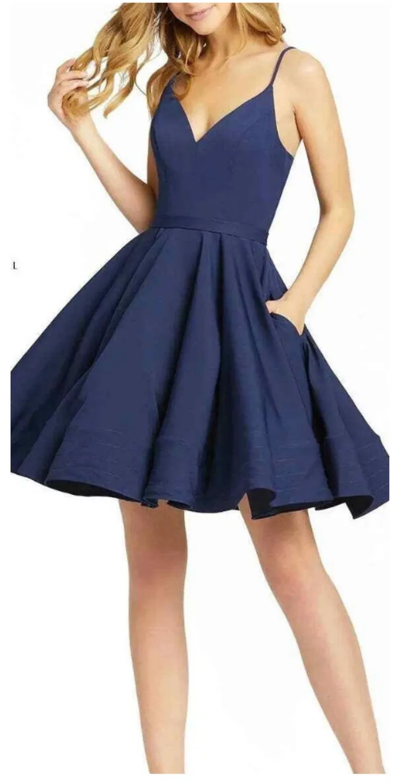 Ieena for Mac Duggal size 0 Navy Blue Mini Dress Fit Flare CocktailStyle 48775 Perfectly tailored fit-and-flare party cocktail dress from Mac Duggal finished with a deep v-neck and pockets. Navy Blue Ieena for Mac Duggal Fully Lined Back Zipper 100% Polyester Sleeveless Cocktail Length V-Neck Approx. length from shoulder to hem: 34.5" Bust Pads Style #48775 Measurements approximate laying flat 15" bust, 12.5" waist, 35" length Cocktail, Romantic, Girly, Cottage, Eclectic, boho, Indie, Valentines, Date Night, coastal, beach, travel, tropical, Eclectic, bachelorette, club, night out, special occasion, holiday, derby, concert, minimalist, vacation, travel, cruise, girls trip, resort, chic, birthday, event, winery, wine tasting, honeymoon, retro, vintage, pretty, feminine, engagement, Euro Summer, Picnic, Mediterranean, Neutrals, Club ready, Scandi, Euro, Polished, Rodeo, Maximalism, Botanical, Garden, Timeless, Ranch